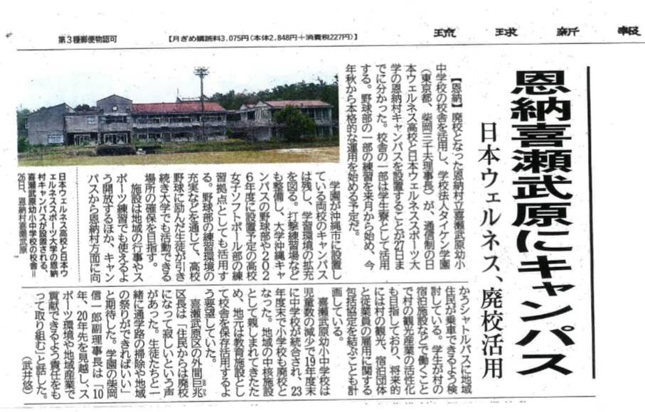 学校法人タイケン学園は、沖縄県恩納村喜瀬武原に日本ウェルネス高等学校並びに日本ウェルネススポーツ大学に新校舎を設置することになりました。