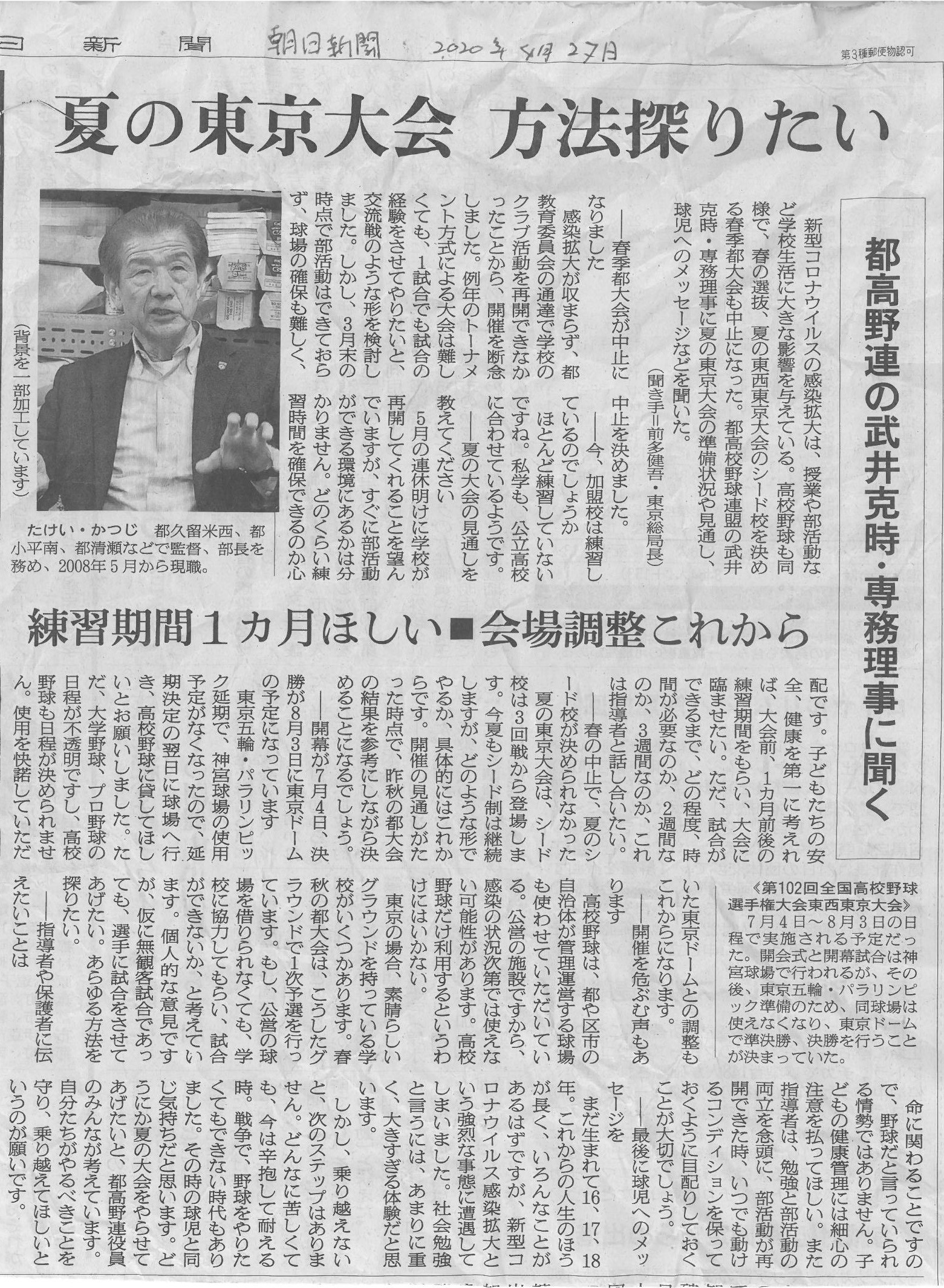 2020/04/28夏の高校野球 日本ウェルネススポーツ大学武井教授の記事